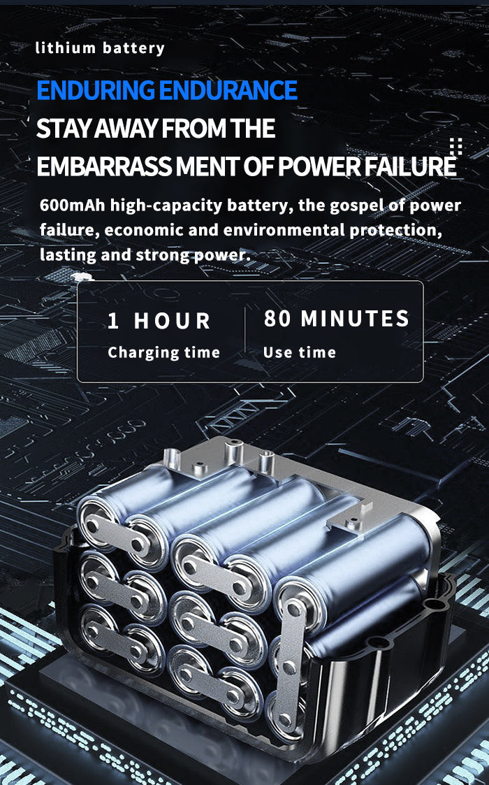 - ლითიუმის ბატარეა USB დატენვით: უზრუნველყოფს 80 წუთამდე უსადენო მუშაობას მრავალმხრივი გამოყენებისთვის ყველგან.